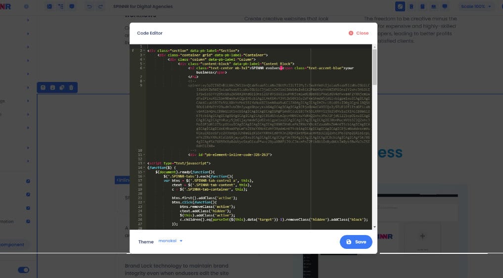 SPINNR offers full access to the website’s code, allowing you to create without restrictions. The best of both worlds – a simple, intuitive, safe visual editor, and full code access. And what’s more, no proprietary code! Just standard HTML, CSS, and JS.