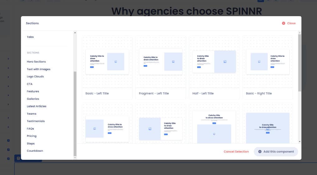 SPINNR includes a large default library of pre-built and optimized components that can be used ‘out of the box’ to build production-ready websites in just minutes. You can also create and save your own custom components to be reused across all your client sites!